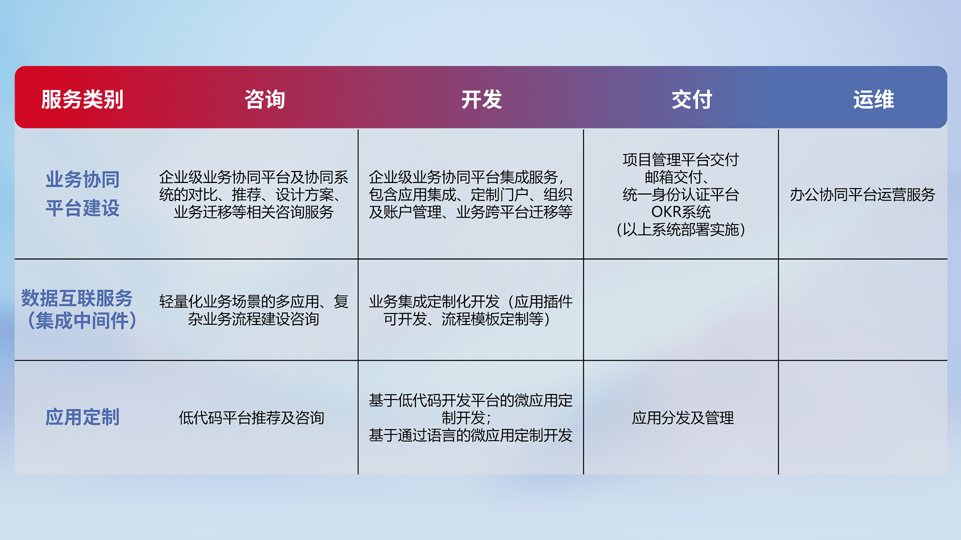 针对钉钉、、企微、、IDaas等平台级产品提供产品的规划、、、方案、、、交付、、、定制化开发等服务,,,实现如统一协同办公、、、、智能客户服务、、、、混合会议管理、、智能数据查询、、、等业务场景,,,,实现数字化转型。。