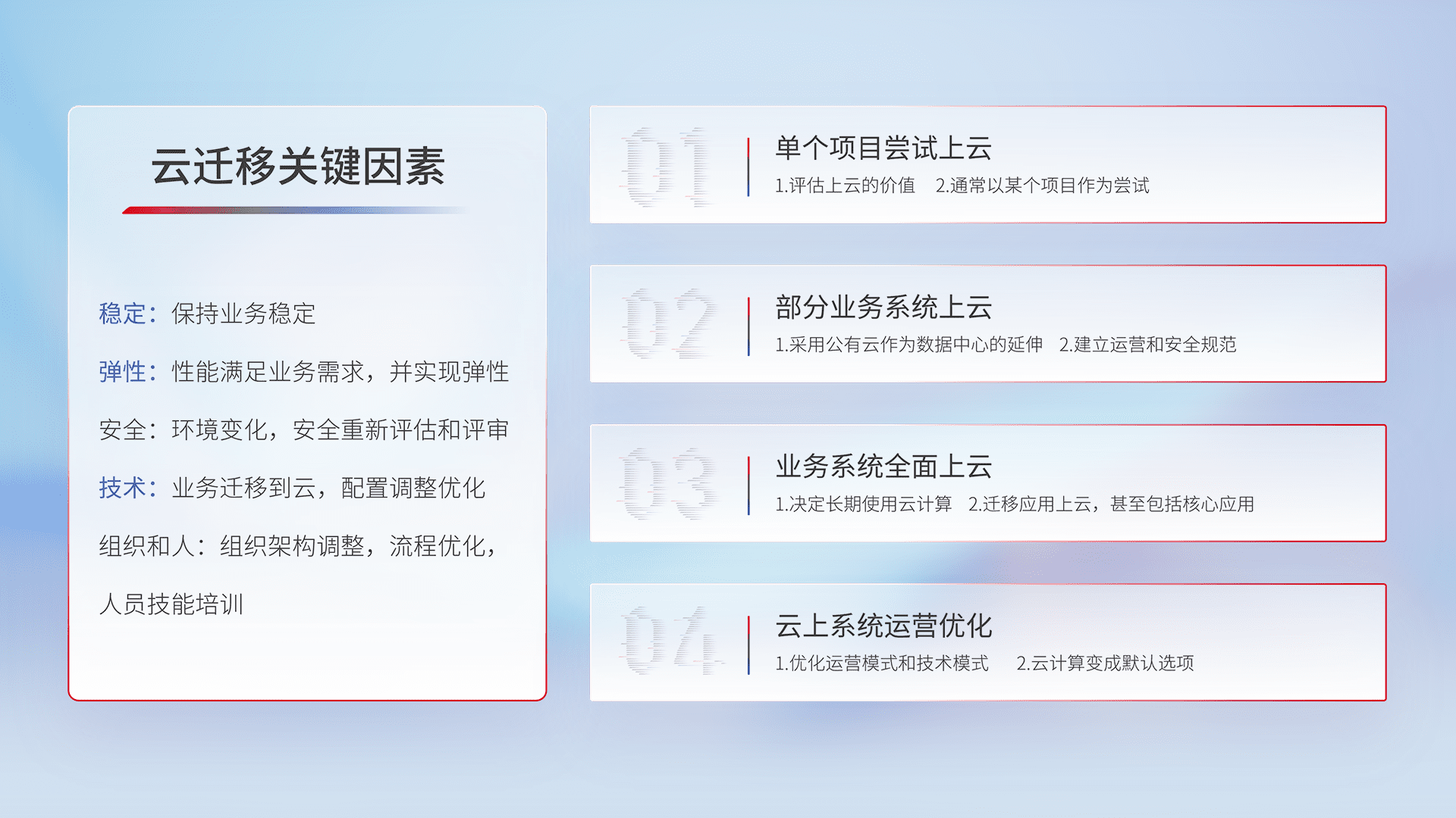 结合实际业务,,,从规划设计、、、、云平台选型、、、云原生改造、、数据迁移、、集成交付,,迁移全过程为客户识别最佳上云路径,,做好风险识别管理,,,设计网络架构、、、、身份权限、、、安全审计合规、、、、操作审计、、、日志审计、、、、监控告警策略、、、多站点容灾设计等,,,,对云上基础设施进行整体规划,,提升IT治理水平,,,,以满足弹性、、、、高可用、、高性能的需求。。。