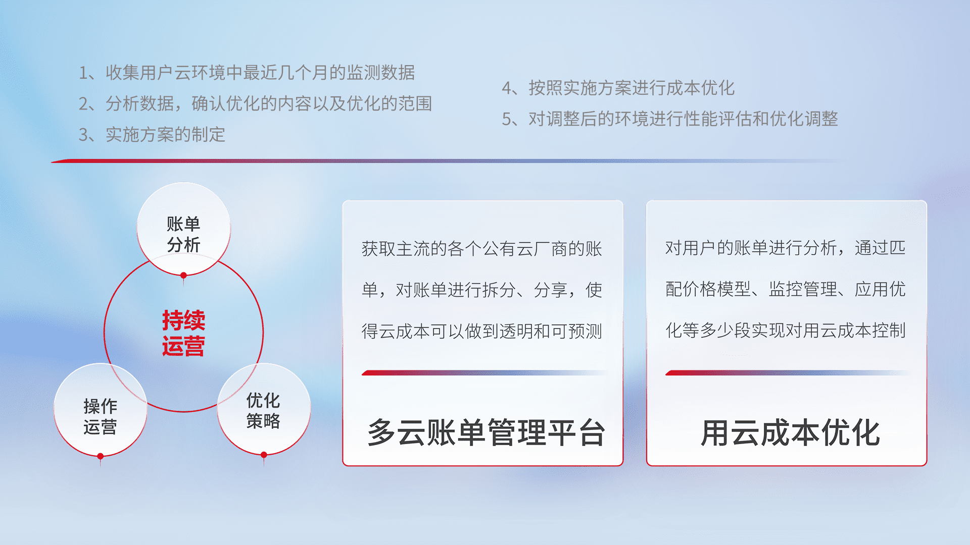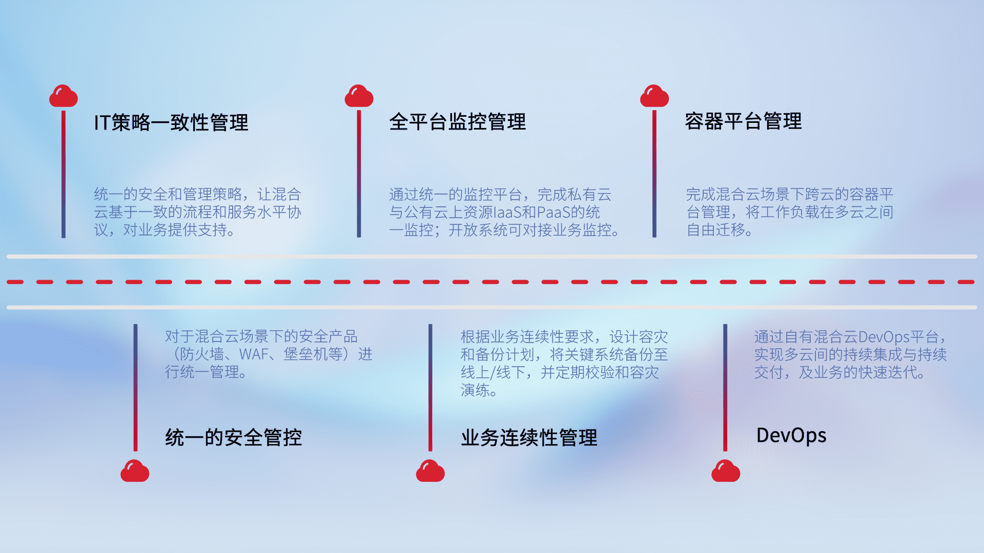 通过多云纳管,,,以统一的资源数据模型把客户的云资源进行抽象和封装,,,,进而实现对多云资源的统一操作,,,,保障云资源管理的可靠性、、、、稳定性与可用性。。。。量身定制化运维内容,,,,配置、、、、开发运维、、、补丁管理、、、备份、、、监控、、、、认证和访问管理、、、审计和日常巡检等,,保障在用云过程中的可靠度,,,,稳定度以及高可用率。。。