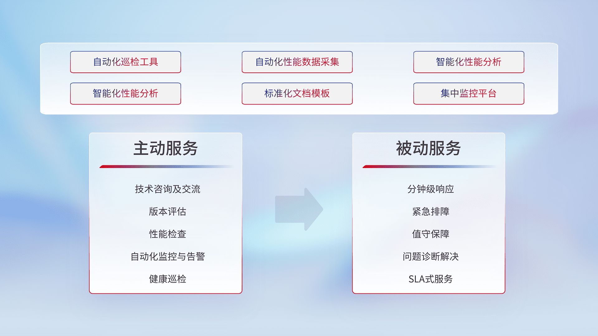 智能化工具和标准化文档,,保障服务质量,,提供主动服务(包含技术咨询、、、版本评估、、性能检查、、自动化监控与告警、、、、健康巡检)和被动服务包含(分钟级响应、、、、紧急排障、、、值守保障、、、问题诊断解决、、、、SLA服务)。。